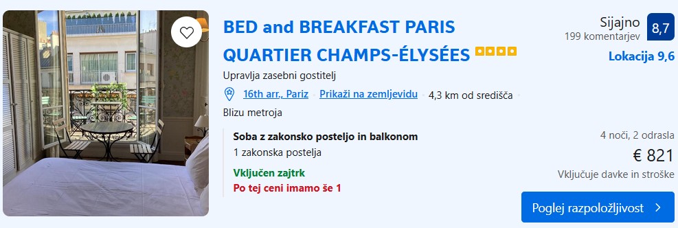 4* BED and BREAKFAST PARIS QUARTIER CHAMPS-ÉLYSÉES – 4 noči – 411€ na osebo (vključen zajtrk)