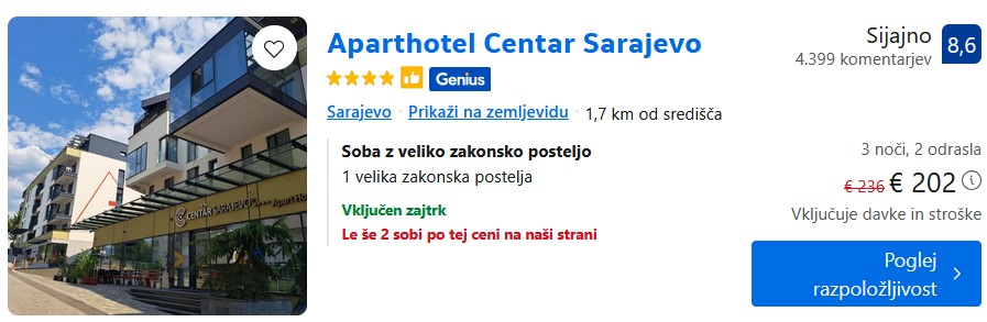 4* Aparthotel Centar Sarajevo – 3 noči – 101€ na osebo (vključen zajtrk) – Genius popust