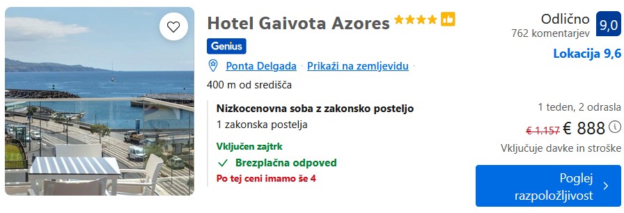 4* Hotel Gaivota Azores – 7 noči – 444€ na osebo (vključen zajtrk) – Genius popust