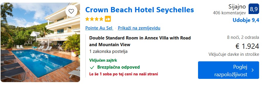 4* Crown Beach Hotel Seychelles – 8 noči – 962€ na osebo (vključen zajtrk)