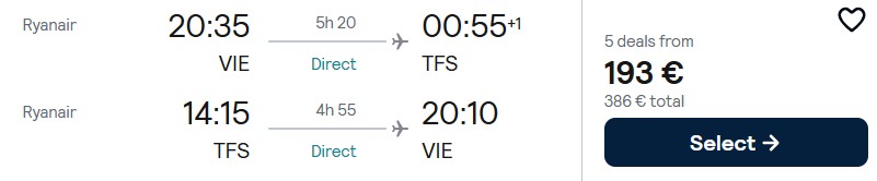 Vienna – Tenerife: 27.4.-04.05.2026 – 193€ (mala ročna prtljaga)