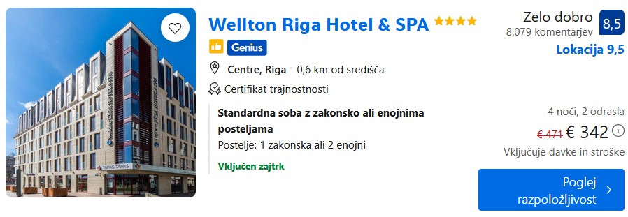 4* Wellton Riga Hotel & SPA – 4 noči – 171€ na osebo (vključen zajtrk) – Genius popust