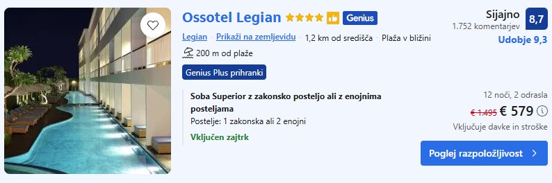 4* Ossotel Legian – 12 noči – 290€ na osebo (vključen zajtrk) – Genius popust